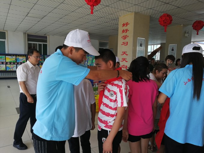 之后,实践队员与企业员工共同为红丝带学校的25名同学佩戴了红领巾,红领巾随风飘荡带着山西药科职业学院和临汾垦荒人企业对红丝带学校每位孩子的牵挂和关爱。