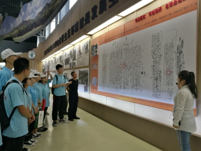 在大泉山水土保持科技示范园内,实践队员参观大泉山水土保持纪念展厅,重温毛主席重要批示精神。通过讲解员的介绍,了解到了大泉山人民不畏困难,迎难而上,在张凤林等同志带领下,一步步在治理水土流失上取得了巨大的成功,成为周边地区学习榜样的奋斗历程。仔细观看了水土保持的图片、实物、模型等,“鱼鳞坑”、“水平梯田”等一些水土保持做法给实践队员们留下了深刻的印象。随后大家又自由参观了许家窑人遗址展厅与阳高文化展厅,感叹古人类伟大的创造力的同时也深入了解阳高丰富灿烂的历史文化。