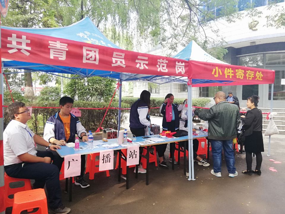 在学院小件寄存处,还有一个与众不同的服务站点,走近他们,你就会发现“共青团员示范岗”几个大字在鲜红旗帜上的分外夺目。这些优秀的青年团员志愿者们把志愿服务的口号落实到行动中,为前来咨询和存取物品的新生及家长耐心服务,解答他们提出的问题,展示了青春、热情的药院学子风采