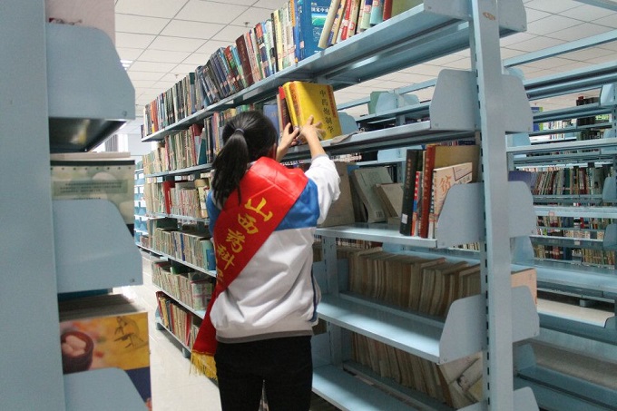 志愿者们认真细致地整理书本、摆放桌椅、擦拭书柜。经过大家的共同努力,图书馆一片整洁明亮,志愿者们都露出了开心的笑容。
