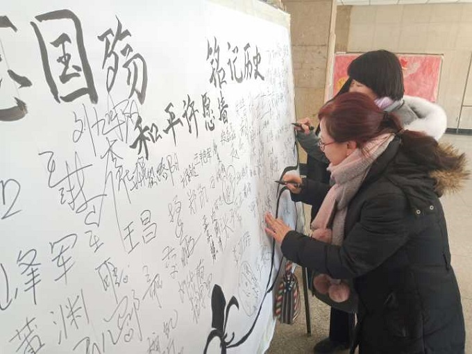 活动伊始,各支部分别召开主题团课,全体同学庄严肃立,低头默哀三分钟,以寄托对当年三十万遇难同胞的悼念之情。接着,团支书介绍了国家公祭日设立的重要意义,并利用多媒体播放了视频资料,呈现了一张张触目惊心的血腥图片。18级医疗器械维护与管理2班的杨军军带来的诗朗诵更是让同学们沉浸在哀思与自省之中。真实的图片、视频,强烈的情感迸发,让同学们牢记这段悲痛的历史,更珍惜现今强大的祖国为我们创造的和平与幸福。团课结束后,同学们来到“和平许愿墙”,留下自己热爱和平的心愿。
