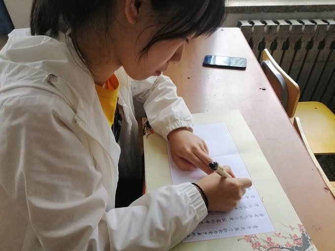 同学们满怀激情,一支笔,一块小方格,用心书写每一个笔画,一个个整齐的字跃然纸上,整体作品美观大方,同学们兴致盎然,教室里翰墨飘香。