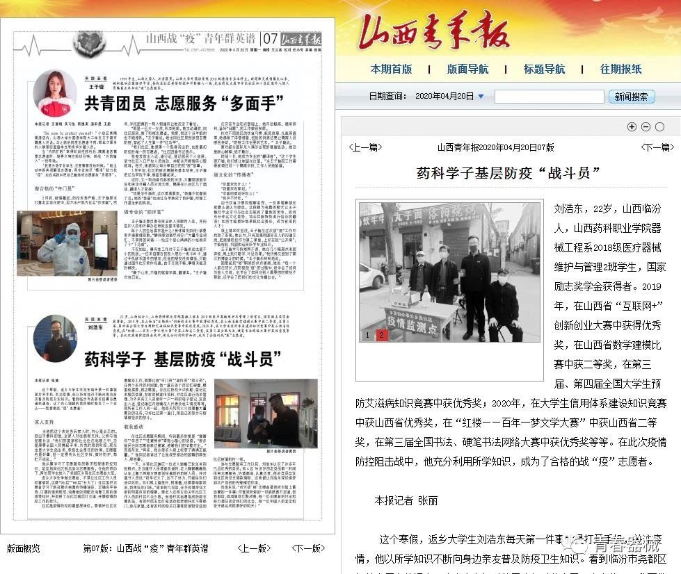 近日,山西青年报报道了我院医疗器械系团员青年刘浩东在疫情防控志愿服务中的先进事迹。今天,让我们一起走近、聆听基层防疫“战斗员”刘浩东的战“疫”故事。
