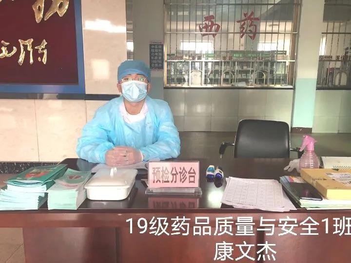 药学系19级药品质量与安全1班康文杰担任乡镇医院的防疫工作,为出入医院的病人进行体温检测和出入登记等工作。