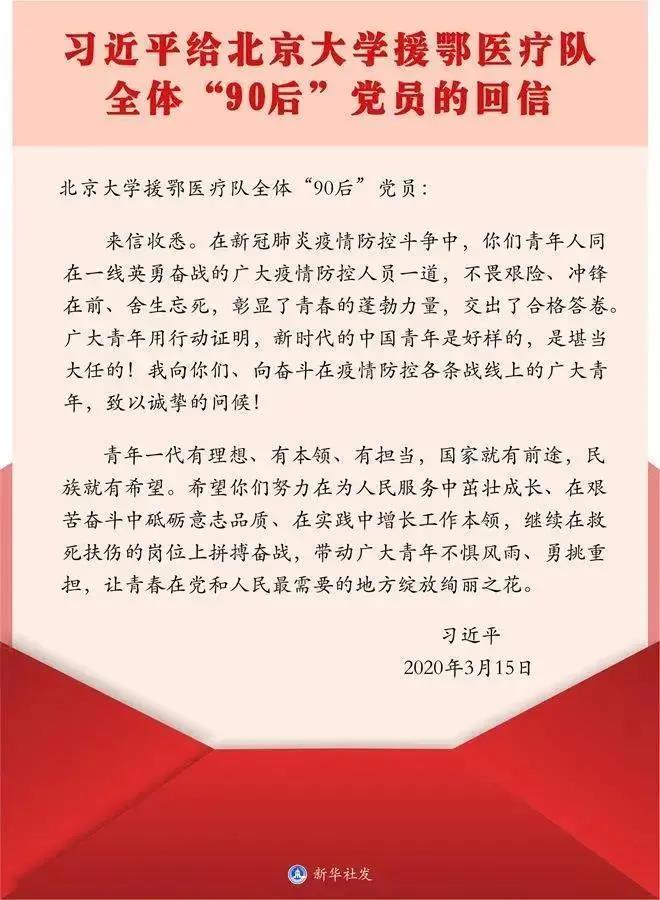 习近平总书记15日给北京大学援鄂医疗队全体“90后”党员回信,向他们和奋斗在疫情防控各条战线上的广大青年致以诚挚的问候。谆谆嘱托,激励着广大青年勇挑重担,为打赢疫情防控阻击战贡献力量,让青春在党和人民最需要的地方绽放绚丽之花。“总书记说我们‘交出了合格答卷’,这是对我们最大的肯定。”他说,“在这场没有硝烟的战斗中,‘90后’党员们一直以实际行动践行着入党时的初心与誓言。这段特殊的经历,也将成为我人生的宝贵财富,激励我在今后的学习中不惧艰险、勇挑重担!