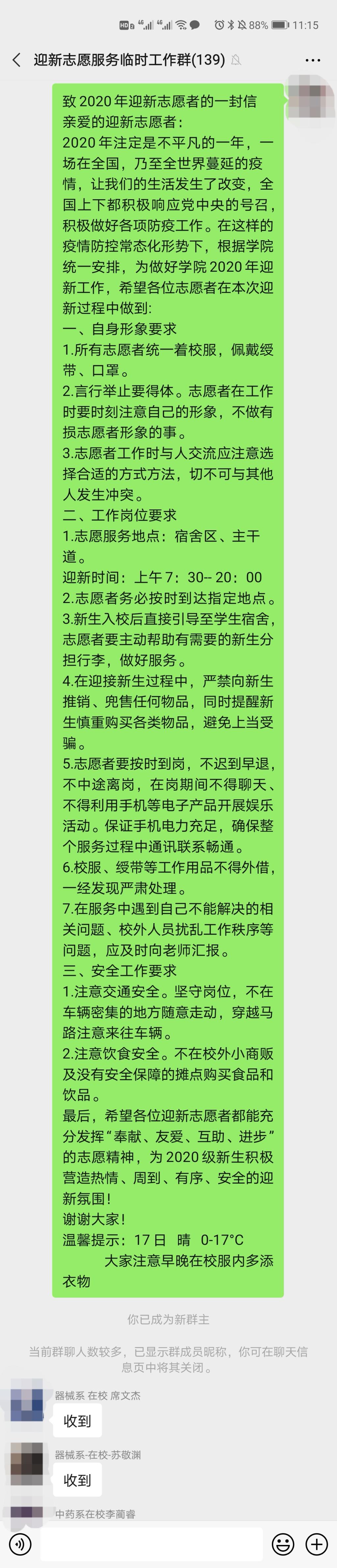 为确保我院迎新工作高效有序进行,院团委精心部署、统筹兼顾,按照疫情防控常态化工作要求,建立了迎新志愿服务临时工作群,发布了《致2020年迎新志愿者的一封信》,对志愿者自身形象、岗位职责、安全防范等方面提出了具体要求。