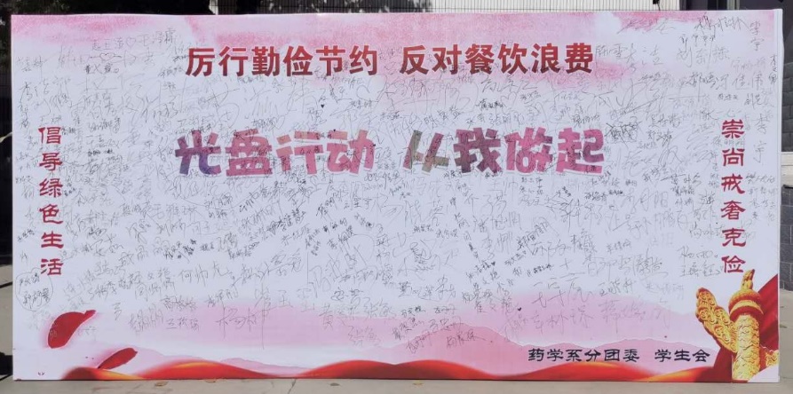 药学系分团委、学生会于10月16—17日,在学生食堂餐厅开展了倡导、践行“光盘行动 从我做起”的签名活动,前来就餐的同学们纷纷驻足,在“光盘行动从我做起”的签名墙上郑重签上自己的姓名,表达了传承勤俭节约传统美德、养成节约良好习惯的决心。
