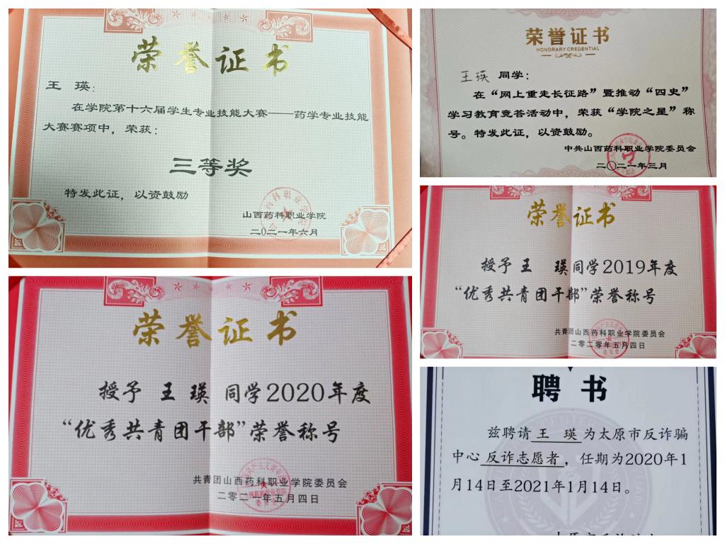 王瑛,女,汉族,2000年12月生,山西太原人,预备党员,山西药科职业学院19级药学6班团支书兼班长。在校期间学习成绩优异,综合测评成绩第一。在校期间我认真学习专业知识,并取得优异成绩。同时,我积极参加各项活动,在校内党政办公室勤工俭学,我踏实肯干,认真负责,能够认真完成各项工作任务。作为一名预备党员,我积极参与社会实践和志愿服务,2020年1月14日在太原市反诈骗中心做志愿者,今年5月份,在山西疫情严重期间,我也很荣幸成为防疫志愿者中的一员,为社会贡献自己的一份微薄的力量。
