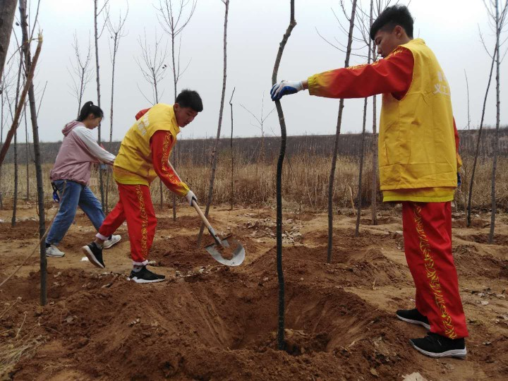 看着来时候没有一丝绿意都是黄土,走的时候已是并排有序的小树苗仿佛都在幸福的对我笑着,图中黄色白大褂扶着树苗的就是我,虽然消瘦的光是一根树枝只有树干没有树叶,但我相信再不久的将来这将会是一片生机,这次的植树活动让我感觉多了一份乐趣,少了一丝疲倦,多了一份家的温馨。