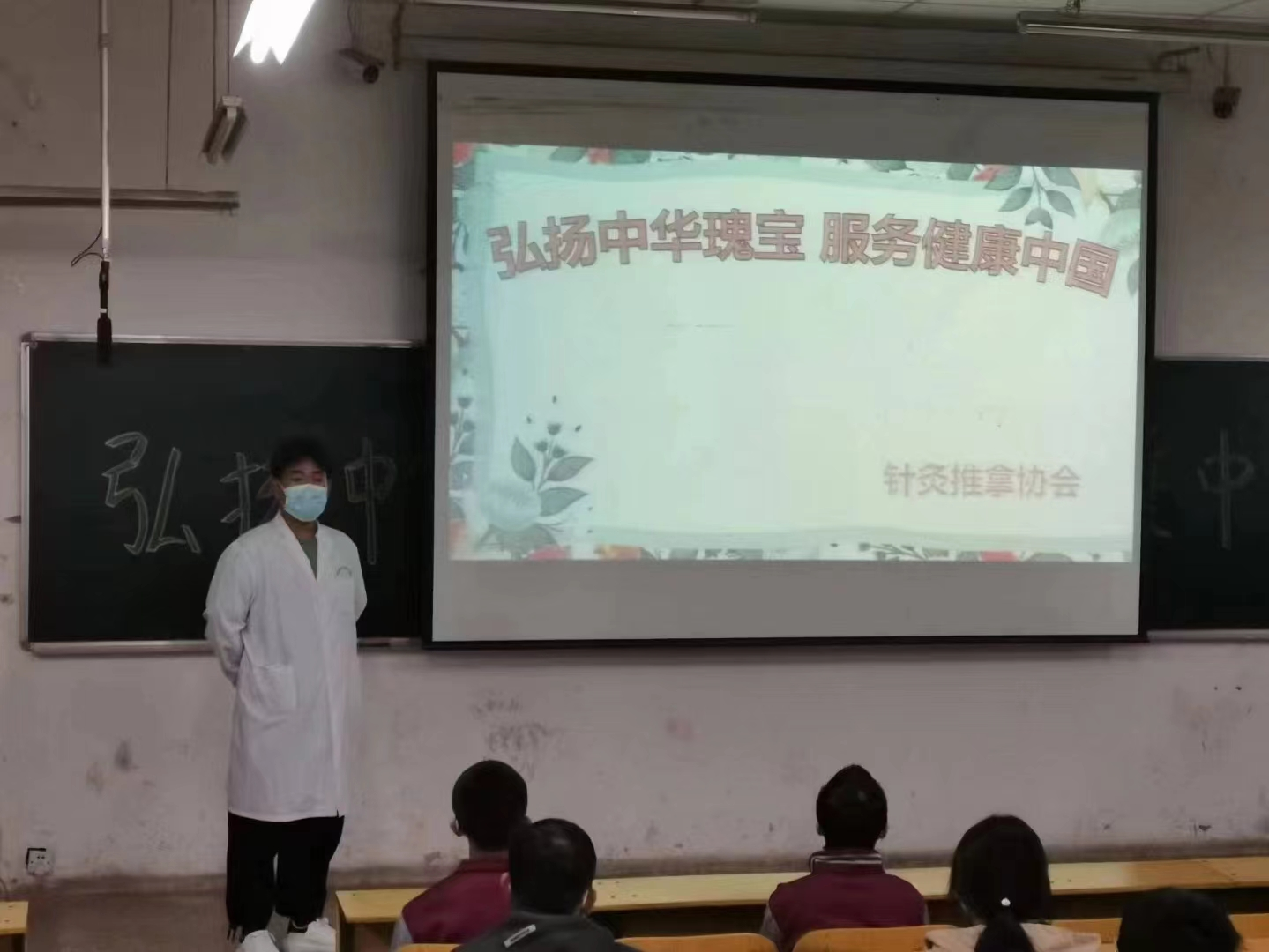 为开拓广大同学视野,培养大家对祖国传统医学的浓厚兴趣,营造传承和弘扬中华传统文化的浓厚氛围,近日,针灸推拿协会面向全院组织开展了“弘扬中华瑰宝,服务健康中国”主题活动。