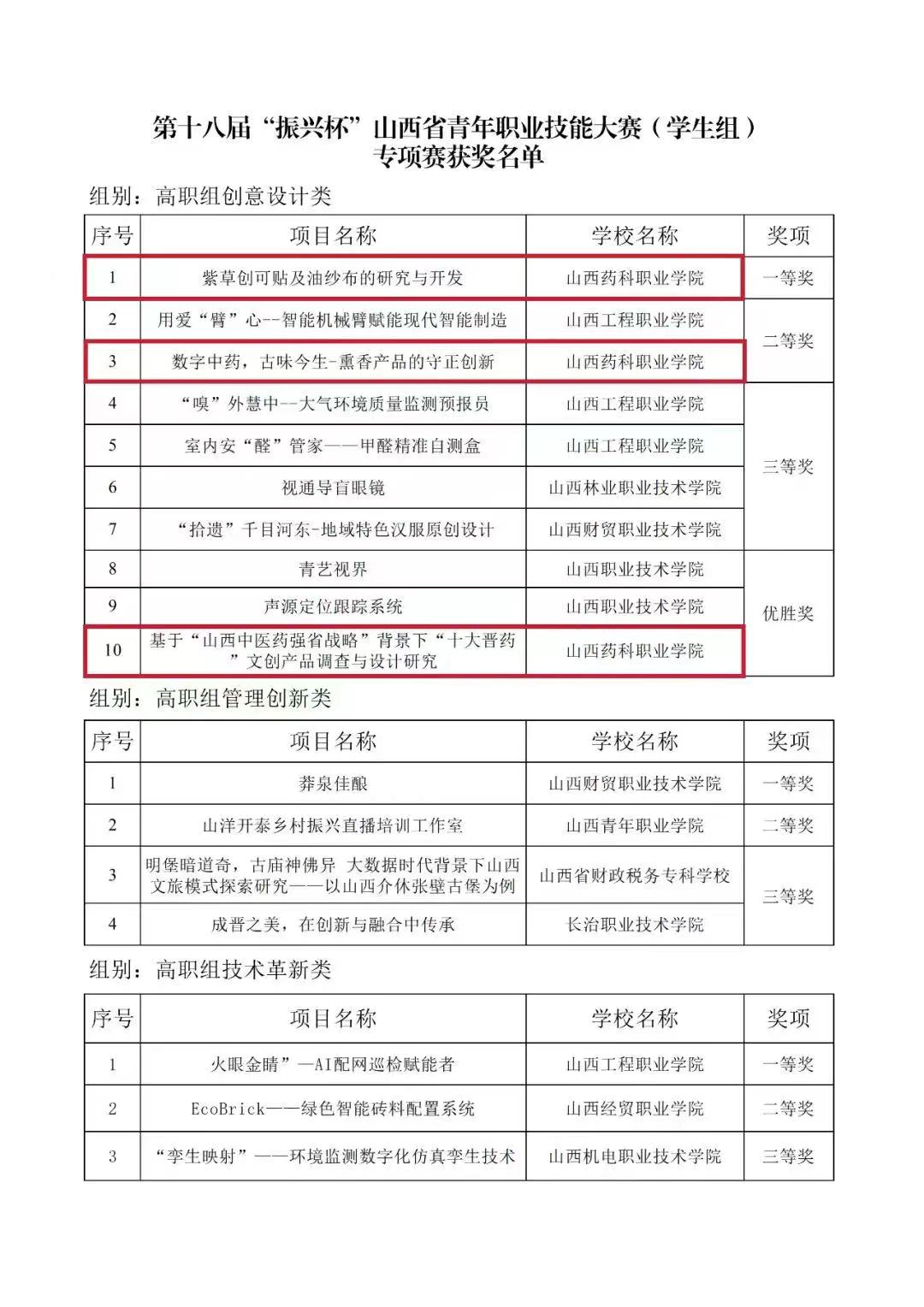 金秋九月,硕果丰盈。在刚刚落下帷幕的第十八届“振兴杯”山西青年职业技能大赛(学生组)专项赛中表现抢眼,我院选送的参赛项目共获得一个一等奖、一个二等奖、一个优胜奖的优异成绩。多年来,我院在“双高”院校建设中,以“三全育人”提升工程为抓手,系统化构建“一、二、三课堂”融通机制,大力培养德智体美劳全面发展的药院新人,有效提升的人才培养质量,为师生创新创业工作打下了坚实的基础。未来,学院将持续做好师生“双创”工作,强队伍、搭舞台、开路径,为学院师生提供更多提升自己、展示成果的平台。