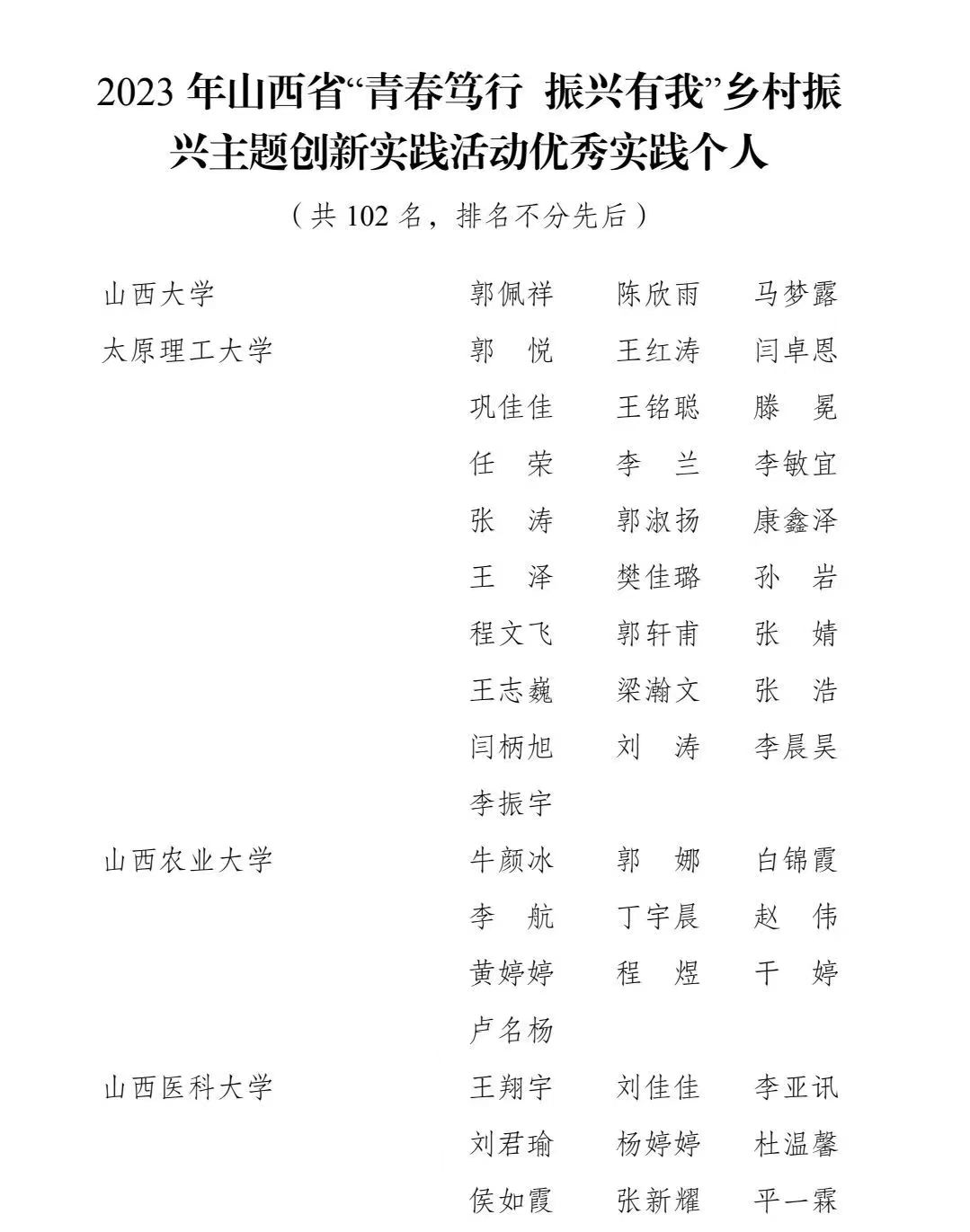 近日共青团山西省委发布《关于表扬2023年山西省“青春笃行振兴有我”乡村振兴主题创新实践活动中表现突出的集体和个人的通报》,我院师生白汇军、李京艺、王鑫荣获2023年山西省“青春笃行 振兴有我”乡村振兴主题创新实践活动优秀实践个人称号。
