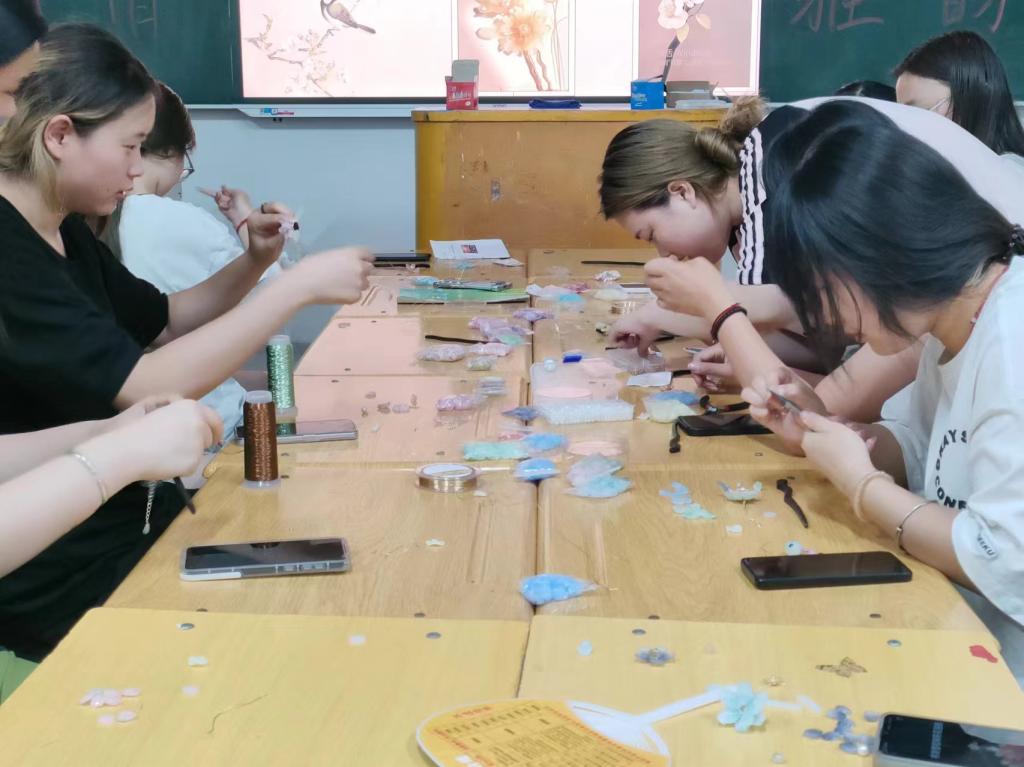 现场活动氛围十分热烈,学生会刘秋燕同学向同学们先介绍了发簪的起源、佩戴方式以及制作发簪的基本材料和方法、基本知识。大家拿到手工发簪材料包时,都被琉璃质感的花瓣、嫣红的叶子、圆润的珍珠所吸引,迫不及待地准备动手制作。在负责人的讲解引导下,大家拿起铜丝,将一片片花瓣缠绕、固定。同学们沉浸其中,享受着手工的乐趣,一步步制作出花朵、花蕊、叶子等配件,随后按照顺序组装、固定在发簪上。大家你一言我一语交流想法、奇思妙想横出,活动气氛热烈。