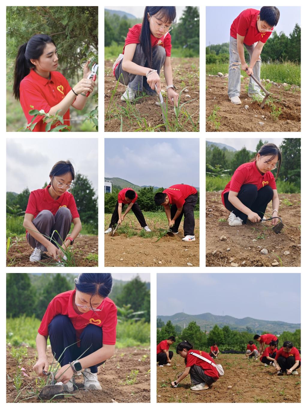 最后,同学们开展了清除杂草的志愿服务活动,尽管骄阳似火,但丝毫未减损大家的饱满热情与昂扬干劲,清除杂草这一环节,乃是保障中药材品质与产量的关键所在,实践队员们秉持高度的责任感与专注精神,全力确保每一株珍贵的药材苗皆能拥有充裕的生长空间及充足的养分供应。