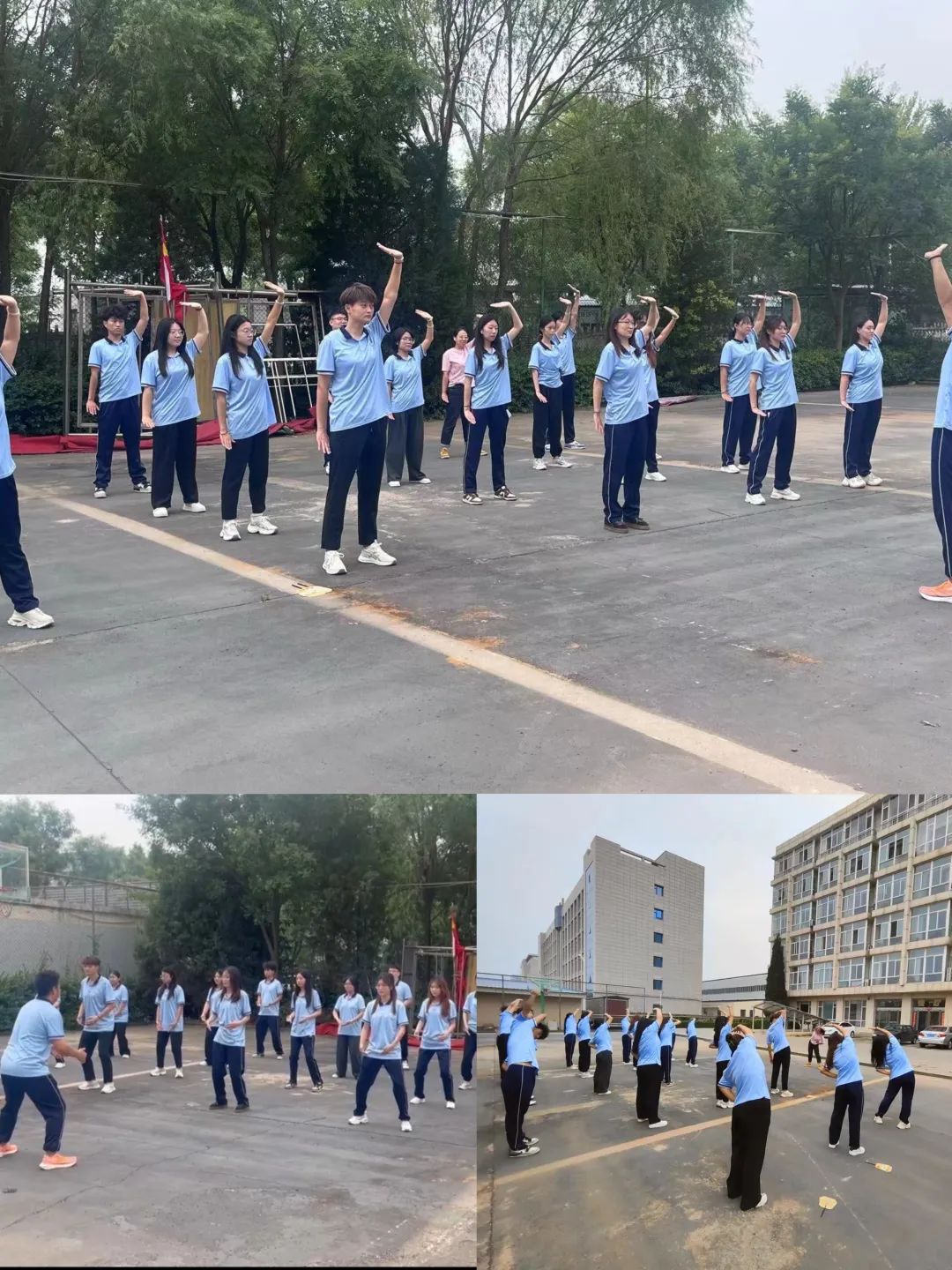 晨跑结束后,同学们在操场上进行八段锦的锻炼。通过练习八段锦,同学们能够舒展身体、增强关节的灵活性和肌肉的柔韧性,同时也能够调整呼吸、舒缓心情,达到身心放松的效果,为一天的学习和实践活动储备足够的精力。