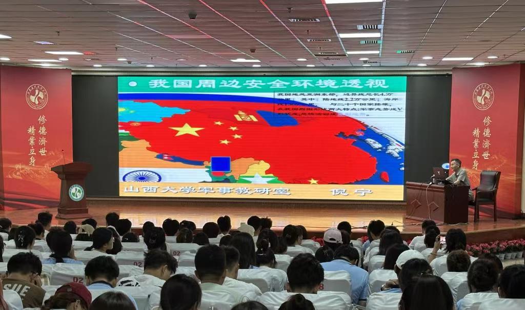 山西大学军事理论教学研究室特聘教授倪宁为全体学员作了题为《我国周边安全环境透视》的专题讲座。倪教授结合当前国际局势和热点问题,深刻剖析了我国周边环境中各种突出矛盾,详细讲解了当前国际环境下各个国家面临的机遇和挑战,使与会学生接受了一次深刻的国家安全教育和爱国主义教育。