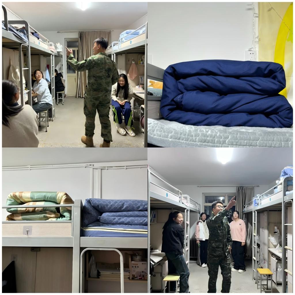 “出门看队伍,进门看内务。一屋不扫,何以扫天下。”宿舍内务整理,是军训的必修课之一。看似简简单单的整理,实则是一门大学问。按照军训被褥叠放、物品摆设的标准。在同学们的努力下,原本平铺的被子被折叠、压实,一捏一折、一捋一叠,他们娴熟的动作尽显流畅之美,分分钟叠出了“豆腐块儿”。教官们也亲临宿舍对他们的劳动成果进行验收以及给予表扬。