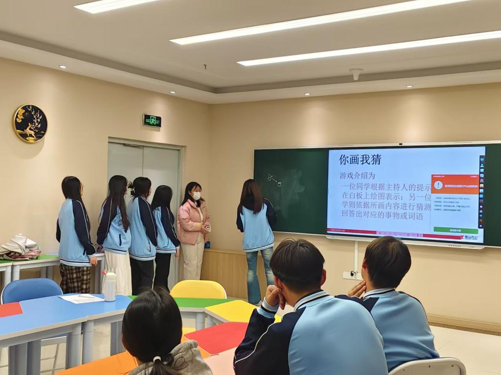 首先展开的是“你画我猜”游戏环节,同学们被分成若干小组,轮流上台参与游戏。小组成员合作无间,抽选词汇后,代表同学通过绘画的形式传递信息,整个过程充满了欢笑与默契。