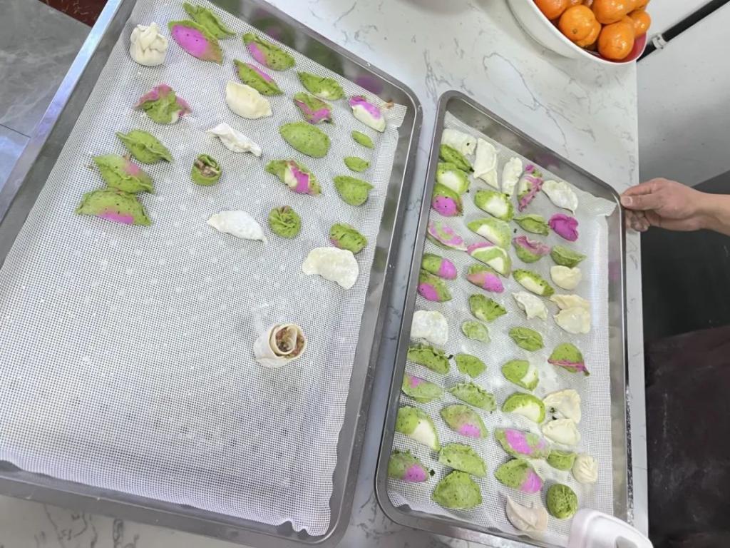 活动伊始,现场人员分为4组,分别为老师组、2023级高本班组、分团委组和学生会组。每张桌子上摆放着色彩缤纷的蔬菜面团、火龙果面团和普通面团,以及猪肉大葱、韭菜鸡蛋两种馅料,还有寓意幸运的花生豆。大家分工明确,揉面、擀皮、包饺子,各司其职,现场还播放着轻快的音乐,气氛轻松愉悦。不一会儿,形态各异、独具匠心的饺子便摆满了餐盘,有精致的花朵饺、饱满的元宝饺,还有小巧的包子饺,院长和老师们对大家的创意与手艺赞不绝口。