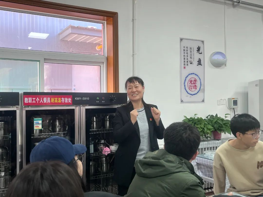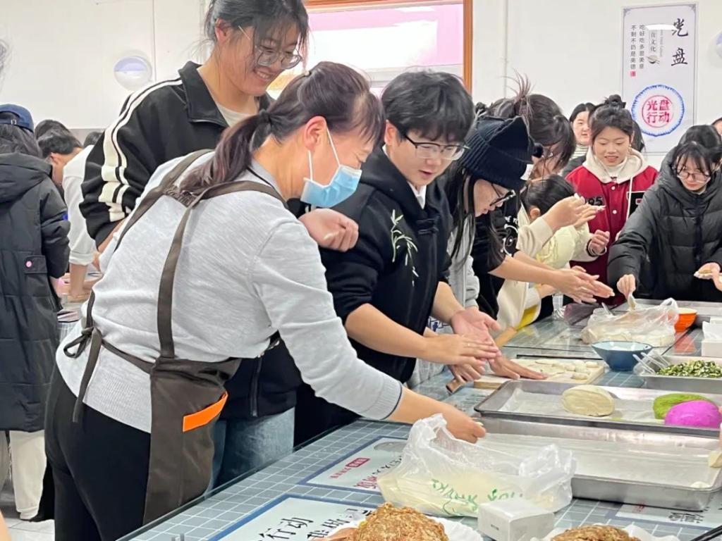 待所有面团包制成饺,大家齐心协力清理现场、摆放桌椅,准备享用劳动成果。院长张轩萍对老师们的积极参与和同学们的热情劳动表达了由衷的感动,同时向提前精心准备食材的工作人员致以诚挚谢意,并送上美好祝愿,愿大家吃了饺子后能够节节高升、诸事顺遂。随后,众人有序排队取餐,丰富的菜品令人垂涎欲滴,除了热气腾腾的蒸饺与水饺,还有凉拌菜、回锅肉、地三鲜等佳肴,以及纸杯蛋糕、酸奶、糖果等甜品,水果则有橘子与柿子。用餐过程中,“幸运儿”们惊喜地吃到包有花生豆的饺子,收获了众人“好柿花生”的美好祝福。院长和老师们也一一为同学们送上了真挚的节日祝愿。活动尾声,大家主动收拾餐具,清理现场,并热情地与院长和老师们合影留念,用相机定格这一温馨难忘的瞬间。