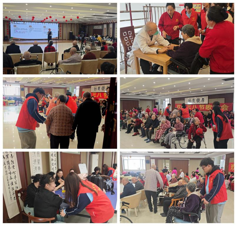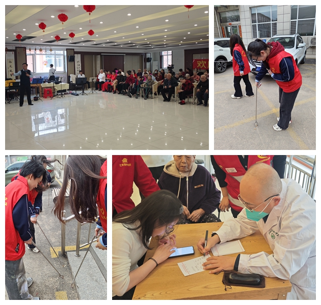 本次活动在社区活动室和养老院同步开展,郝日晋老师结合饮食结构、作息规律等方面为社区居民讲解了春季养生的知识,现场互动频频;赵昌老师开展了义诊活动,为居民现场把脉问诊,受到了一致好评;学生志愿者们到社区养老服务中心为老人们测量血压、打扫卫生,与老人们进行了亲切互动,送去了温暖和欢乐。