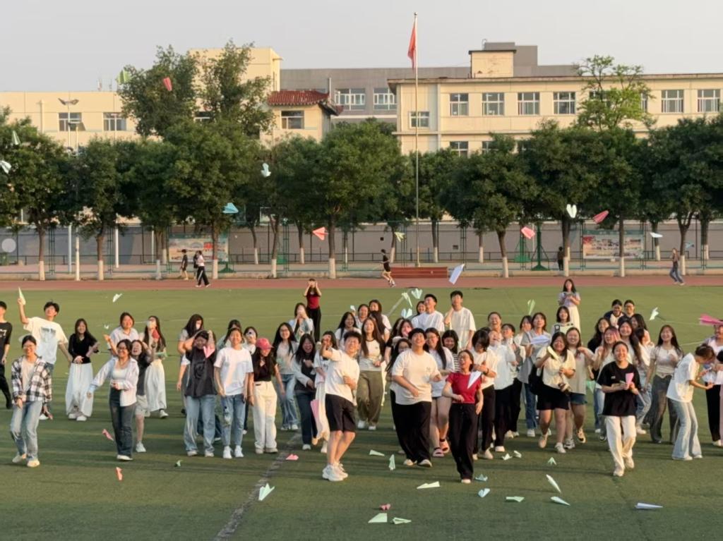 5月26日的午后,操场被阳光镀上一层金色。"放飞纸飞机"活动现场,同学们用彩笔在机翼上勾勒梦想的轮廓:有写给自己的铿锵誓言,有赠予挚友的暖心祝福,更有对未来的无限期许。随着一声令下,数百架纸飞机如振翅的白鸽腾空而起,在蔚蓝的天幕下划出优美的弧线,将青春的朝气与希望带向远方,引得在场师生纷纷举起手机,定格这充满诗意的瞬间。