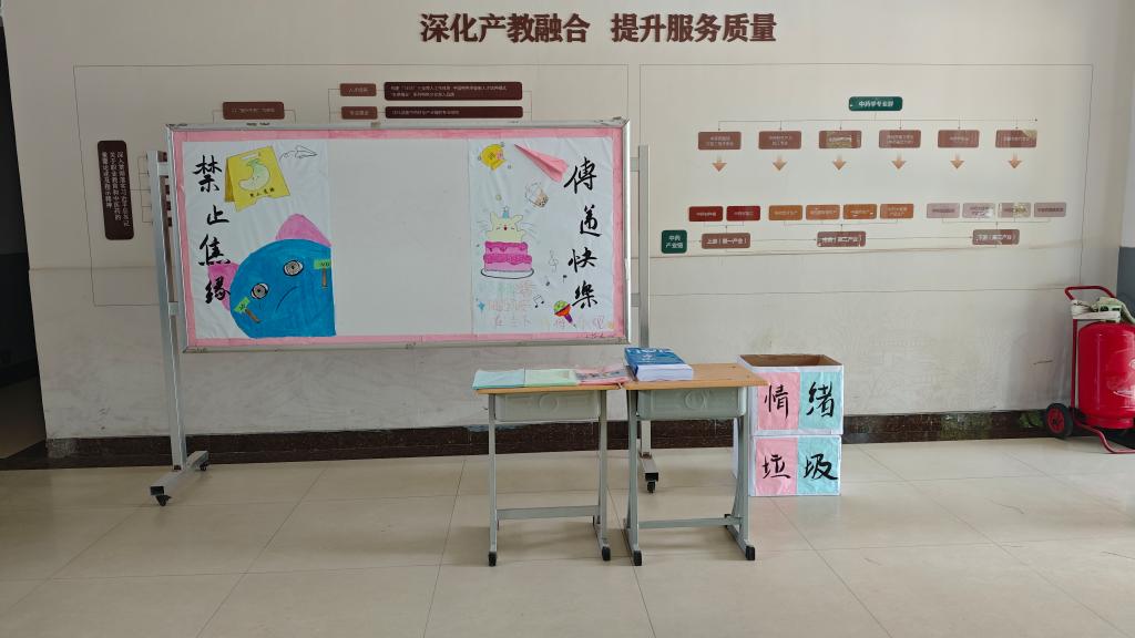 活动首日,一楼大厅化作充满魔力的"情绪驿站"。洁白的"快乐情绪传递板"宛如一张等待书写的诗笺,同学们手持五彩便利贴,将生活中的璀璨瞬间、真挚祝福化作灵动文字:或是清晨偶遇的绽放花朵,或是好友递来的温热奶茶,亦或是攻克难题时的满心欢喜。这些承载着青春温度的话语,渐渐在展板上编织成绚丽的彩虹,引得师生们驻足品读,目光中满是温暖与共鸣。毗邻的"情绪垃圾桶"则是心灵的避风港,同学们将学业的压力、成长的困惑郑重书写,在投入纸张的瞬间,仿佛也将阴霾一并封存。