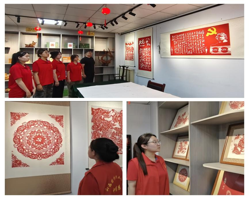 走进文化馆,瞬间被眼前独特的文化图景吸引。剪纸区,党的百年历程以红纸为底精彩呈现——建党百年的数字标识与领袖形象交相辉映,一刀一剪间,革命精神跃然纸上,将红色基因以非遗形式鲜活留存。在非遗馆,红色记忆、中医药智慧与传统艺术深度交融。志愿者们穿梭其间,于方寸展区,触摸到宁武历史文化的厚重与鲜活,让红色中医药调研,多了几分非遗艺术的浪漫注脚。