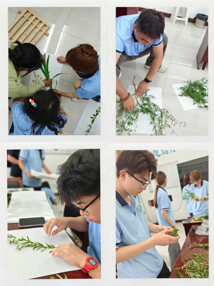 采药回来后,实践队员们投入到标本制作环节。大家先将采集的药材清理干净,去除泥土和杂质,然后小心翼翼地将药材平铺在吸水纸上,调整好姿态,确保每一片叶子、每一根茎秆都舒展自然。接着,用多层吸水纸和硬纸板将药材层层包裹,放入标本夹中,绑紧带子固定压实。