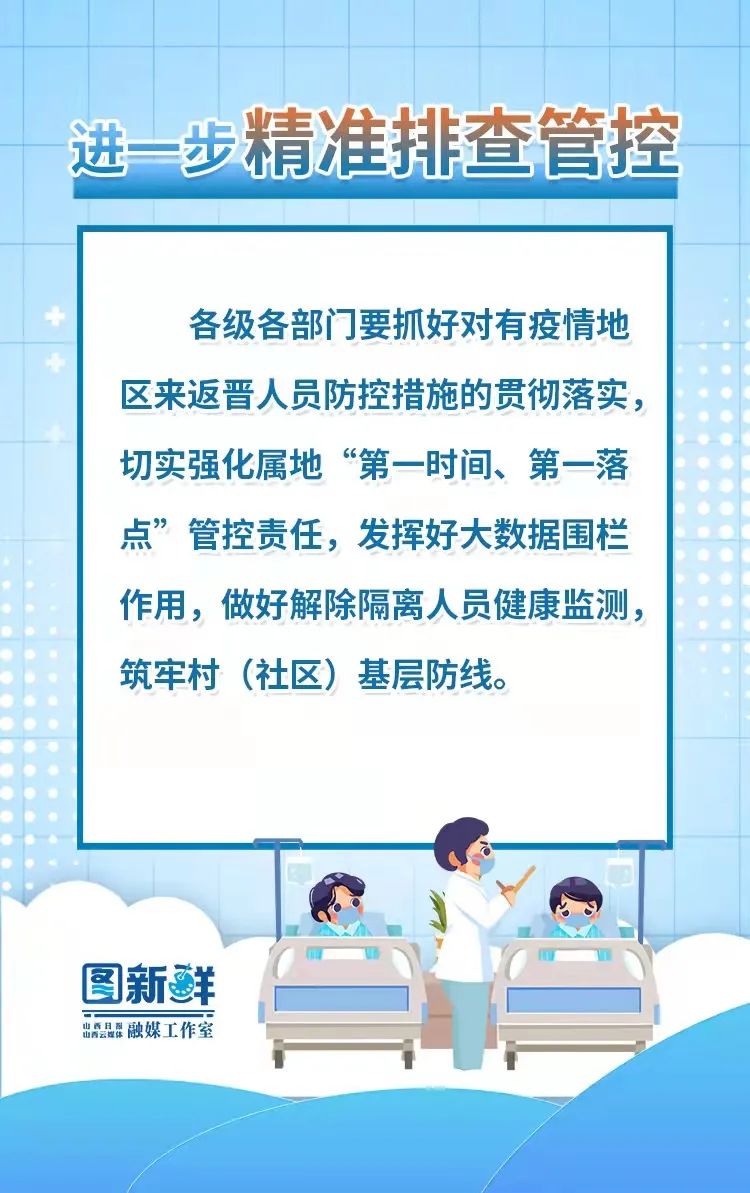 他强调,要深入学习贯彻习近平总书记考察调研山西重要指示精神,认真落实党中央及省委关于疫情防控的部署要求,坚持“外防输入、内防反弹”总策略和“动态清零”总方针,高效抓好晋中太谷输入性疫情风险应急处置,进一步强化常态化精准防控,确保全省疫情防控形势持续稳定向好。