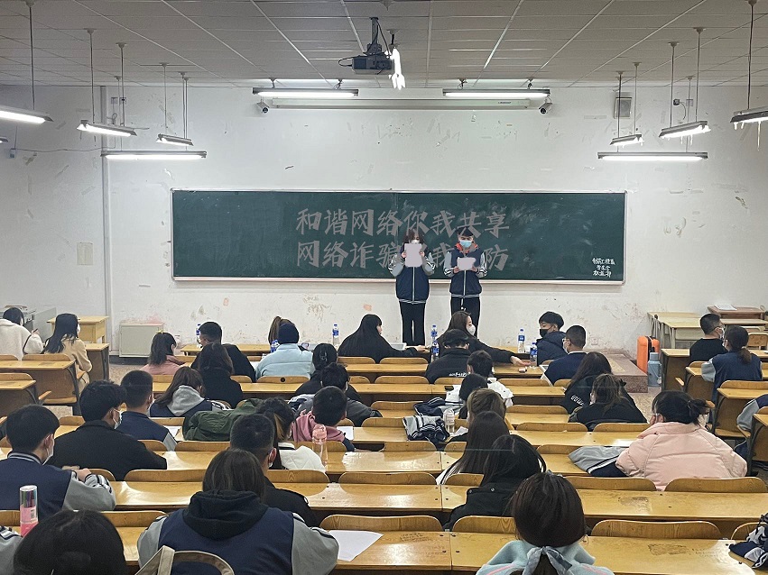活动伊始,主持人以大学生防诈骗这一话题作为切入点,从诈骗类型、手段以及防范措施等多个方面展开,并通过播放防诈骗宣传短片,向同学们介绍了电信诈骗的几种形式以及大学生应对电信诈骗的措施。