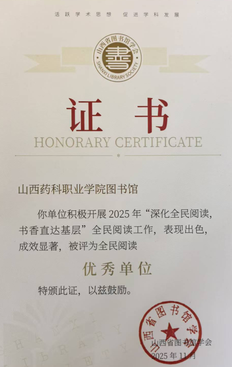 近日,山西省图书馆学会公布2025年全民阅读工作表扬名单,我院图书馆凭借体系化活动布局、创新化推广路径与实效化育人成果,荣获山西省全民阅读“优秀单位”称号。