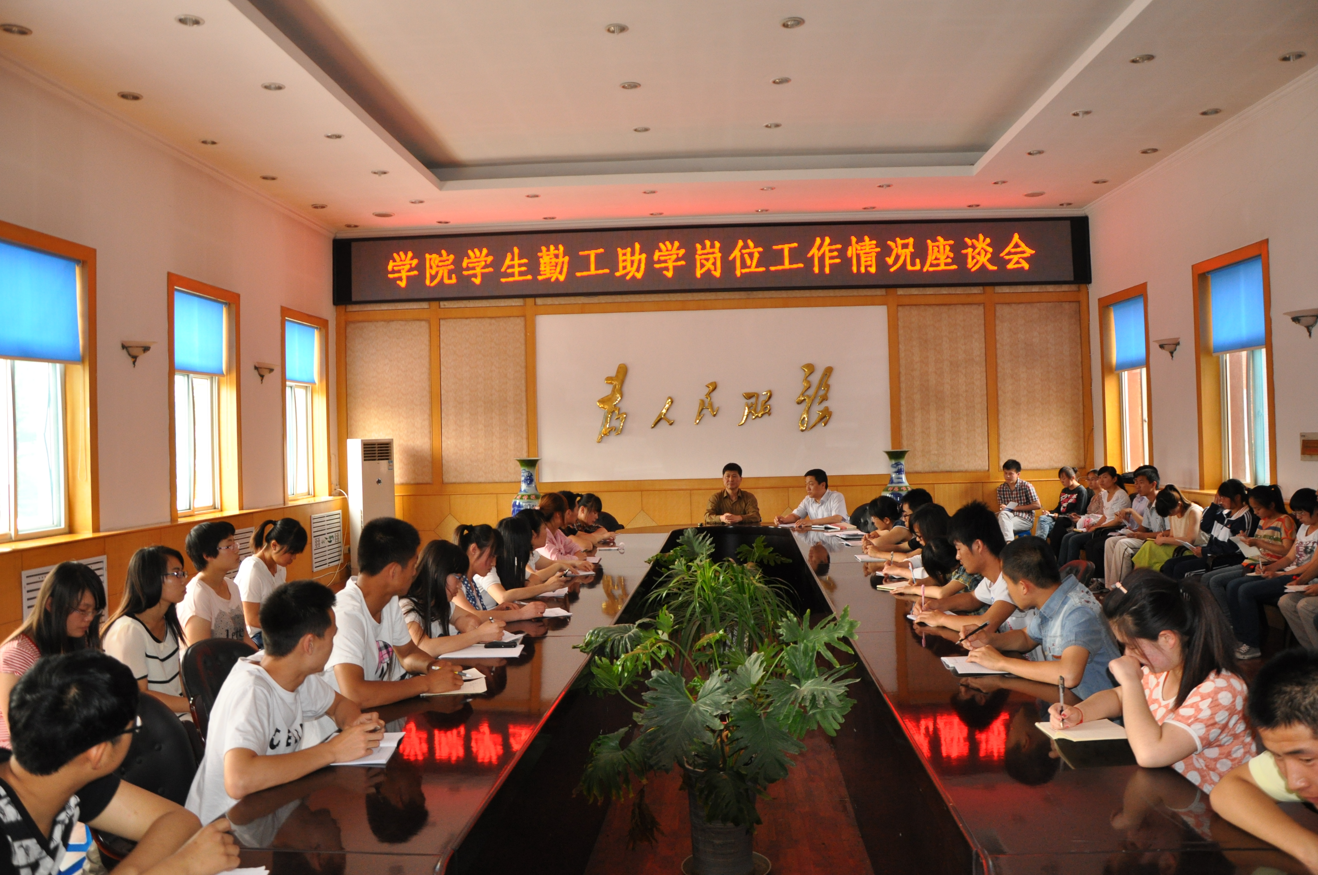 为深入了解我院学生勤工助学情况,更好地开展大学生资助工作,2013年5月13日下午,学院在大会议室召开了第一次勤工助学学生座谈会。党委委员、副院长胡尔雅同志出席座谈会。学生工作(部)处负责人、相关老师及44名勤工助学学生参加座谈。会议由学生处处长彭志强同志主持。