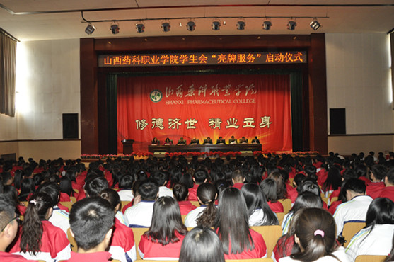 会议发布了《关于做好山西药科职业学院学生会“亮牌服务”工作的通知》文件;院领导亲自为学生会干部代表佩戴了工作牌。