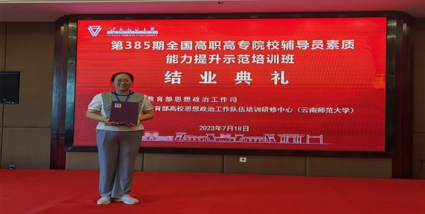 7月15日-18日,由教育部思想政治工作司主办、高校思想政治工作队伍培训研修中心(云南师范大学)承办的第385期全国高职高专院校辅导员素质能力提升示范培训班在云南师范大学举行。来自全国80余所高职高专的专职辅导员参加培训。我院辅导员方育婧参加了本期培训班并顺利结业。