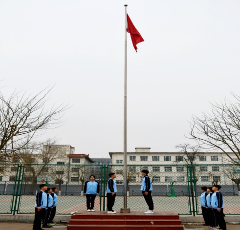 早上8时整,升旗仪式开始,国旗护卫队队员在师生的注目礼中护送鲜艳的五星红旗进场,随着雄壮豪迈的国歌声,五星红旗冉冉升起,全体师生肃立,行注目礼。