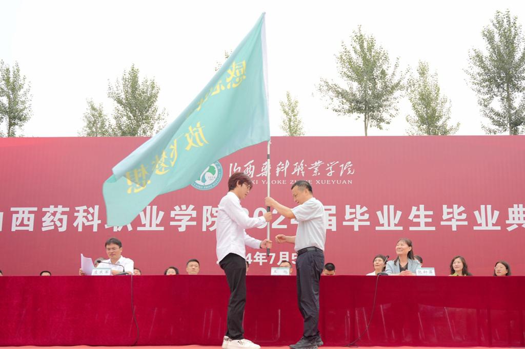毕业生向学院敬献纪念旗。临别之际,学院党委书记王旭诚挚祝愿同学们行而不辍,未来可期,希望毕业生们不负母校嘱托,主动将青春小我融入祖国大我,将个人的青春梦融入伟大的中国梦,在医药行业市场广阔、大有可为的时代,乘势而为,为祖国医药卫生事业的发展和人类身心健康奉献自己的力量。