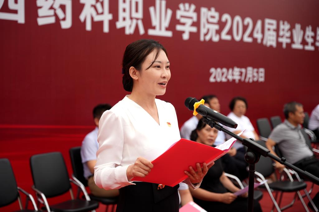 2021级药学1班学生贺晓惠作为毕业生代表上台发言,她回顾了自己在学院三年来的成长经历,分享了入选西部计划志愿服务项目的心路历程,表达了自己作为药科学子,勇担时代重任,到祖国最需要的地方去的报国志向。