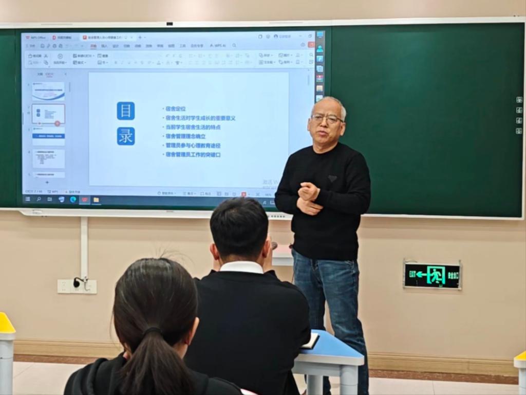2025年4月21日,心理健康咨询中心主任刘建勇以“做好学生公寓心理健康教育工作的要点”为题进行培训第四讲。刘主任系统分析了当前学生公寓生活的特点,通过阐释学生公寓管理的理念,结合自身工作经验,详细讲解了心理健康教育工作的方式方法及实践突破口,并激励大家在“一站式”学生社区建设中,要开展好学生心理健康教育工作,努力为学生营造更暖心温馨的成长氛围。