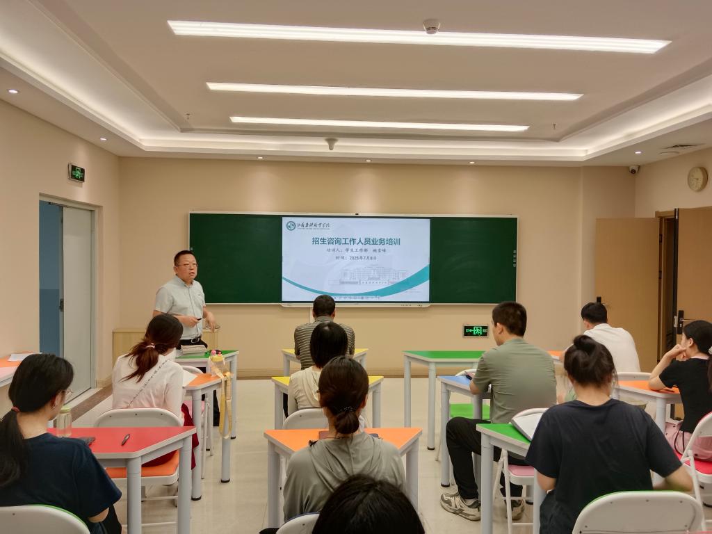 为进一步提升学院招生咨询工作人员专业能力和服务水平,积极应对暑期招生咨询高峰,扎实开展学院 2025 年暑期招生咨询工作,促进学院招生工作平稳有序开展,7 月8 日上午,学生工作部组织承担暑期招生咨询任务的本部门及驻楼辅导员共 25 人,召开招生咨询工作人员业务培训会,会议由学生工作部副部长姚雪峰主讲。